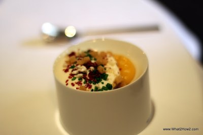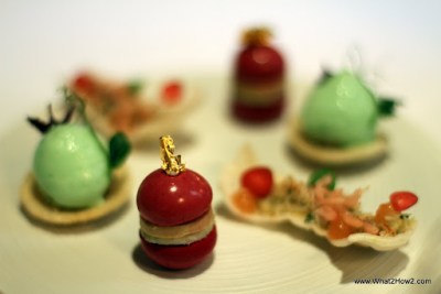 | Amuse 2, 3, 4 – Crab on Kropok, Apple foam and in front, beetroot and Fois Gras |