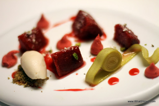 | Mackerel, onion and Beetroot sorbet as an inbetween |