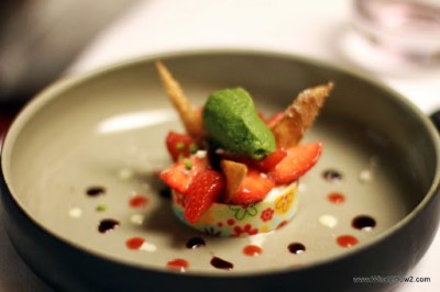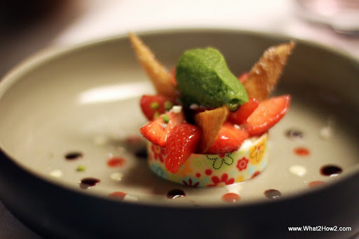 Marinated Strawberrys, white chocolate, crispy Sesame sablé and lovely herbs sorbet and many little dots of taste |