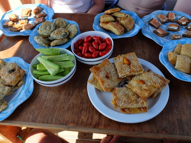 | Lunch on the boat NOTOS, sailing with Nikos in the bay of Chania |